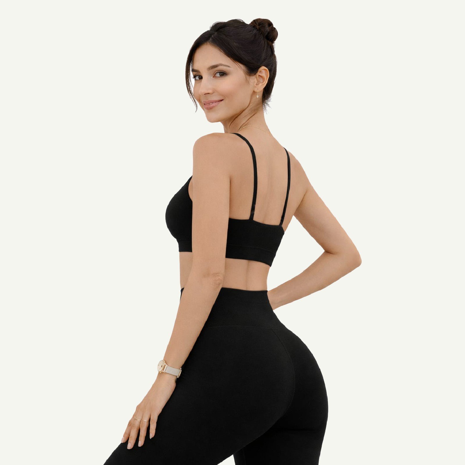 Το seamless ύφασμα από μαλακή λύκρα προσφέρει εξαιρετική ελαστικότητα και προσαρμόζεται ιδανικά στο σώμα, χωρίς να περιορίζει την κίνηση. Το top διαθέτει λεπτές τιράντες και ελαφριά υποστήριξη στο στήθος, ενώ το κολάν με ψηλή μέση βοηθά στη σταθερότητα και αναδεικνύει τη φυσική γραμμή του σώματος.