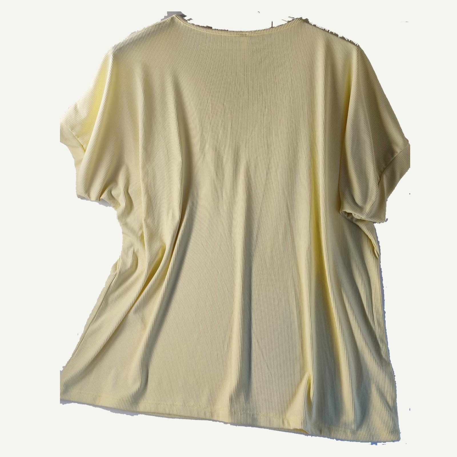 Η rib υφή δημιουργεί μια διακριτική γραμμική δομή στο ύφασμα που δίνει χαρακτήρα στο ρούχο χωρίς να το βαραίνει. Η μπλούζα έχει χυτή, χαλαρή γραμμή (loose fit) και πέφτει ελεύθερα πάνω στο σώμα, χωρίς να εφαρμόζει στενά.